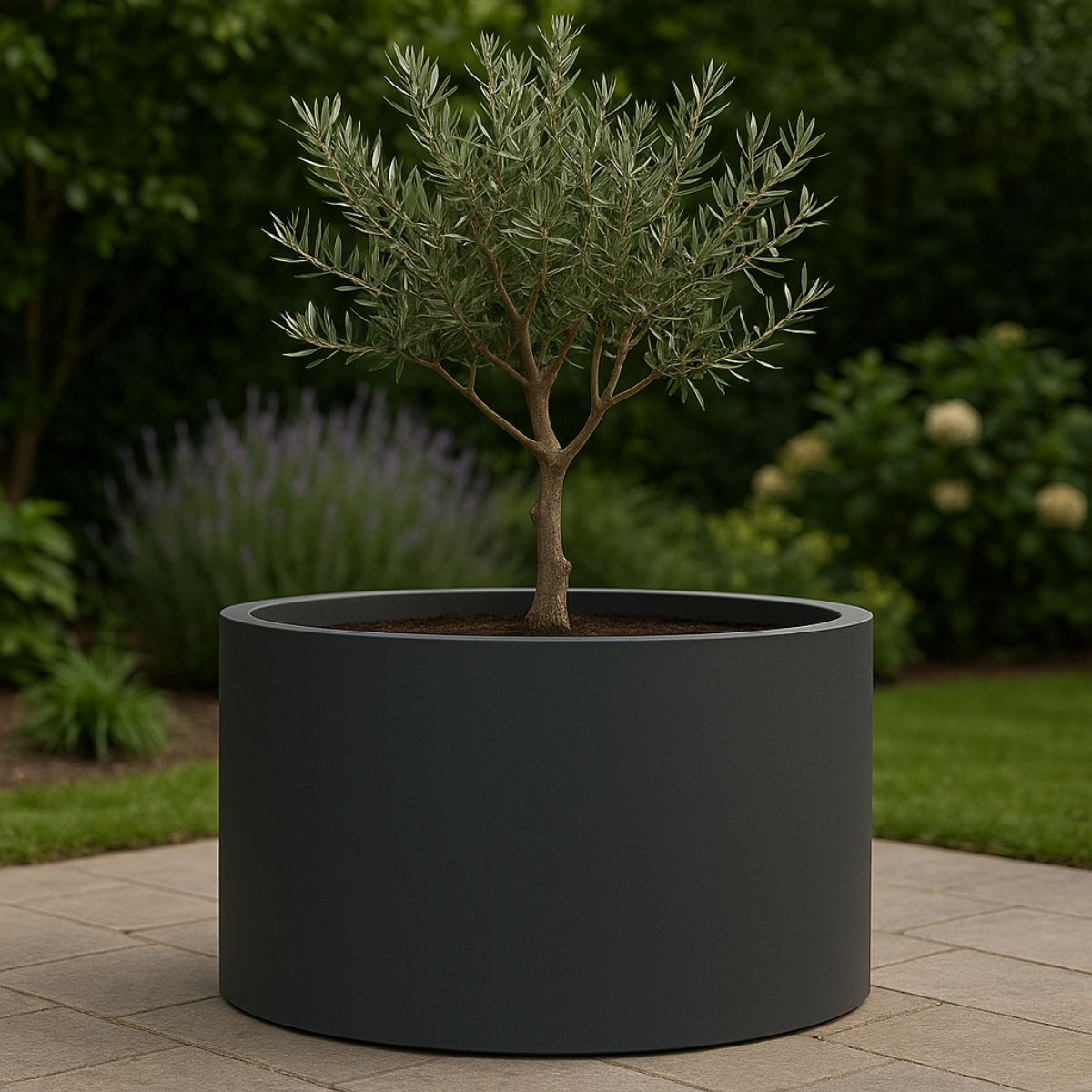 Bestellen Sie noch heute Ihren runden Polyester-Pflanzkübel Ø 100x60 cm Schwarzgrau (RAL 7021)!