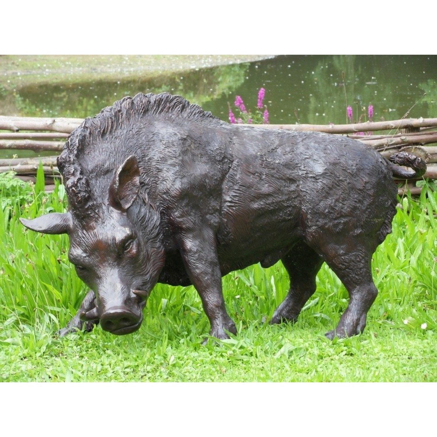Die bronzene Wildschweinskulptur (51 x 41 x 94 cm (HxBxL)) zeichnet sich durch ihre lebendige Patina aus, die durch einen sorgfältigen chemischen Prozess entsteht, der die natürliche Gelb- oder Kupferfarbe der Bronze in kräftige Farbtöne wie tiefes Braun, Grün oder Schwarz umwandelt. Dies verleiht jedem Bild ein einzigartiges Aussehen und sorgt dafür, dass es in jeder Umgebung Aufmerksamkeit erregt. Ob drinnen oder draußen platziert, es bleibt ein markantes Kunstwerk.