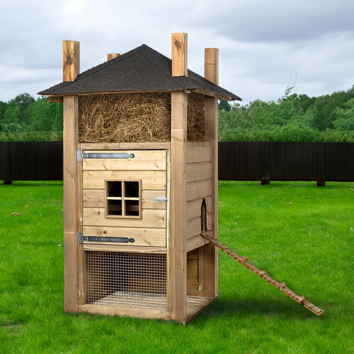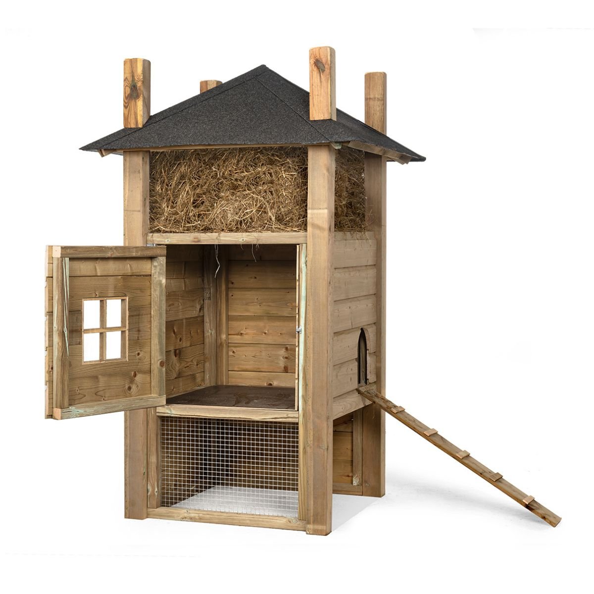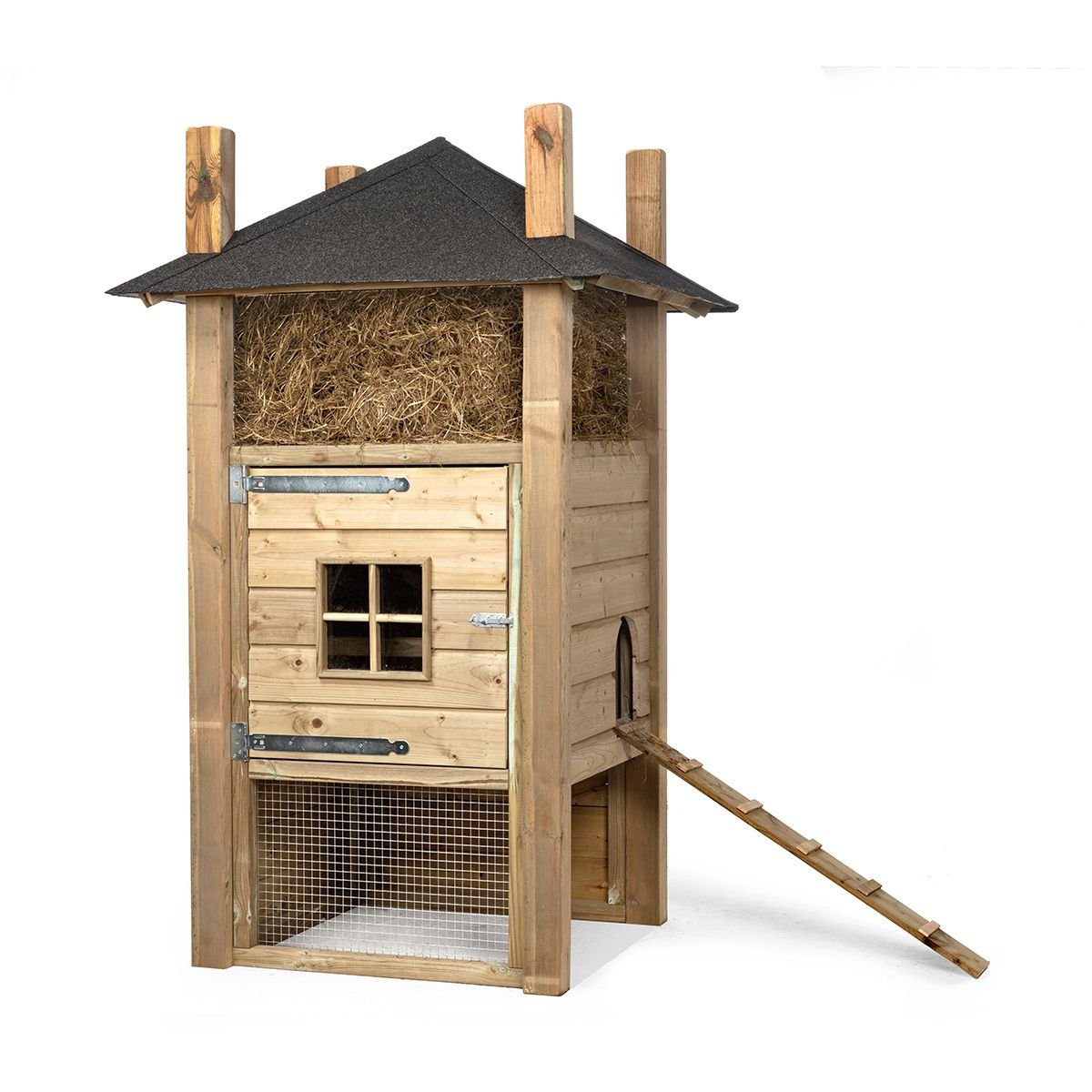 This chicken coop is equipped with a spacious haystack with storage space for hay or straw, so that you always have sufficient supplies at hand. The integrated steps ensure that your Chickens can easily walk in and out, which promotes their freedom of movement and well-being.