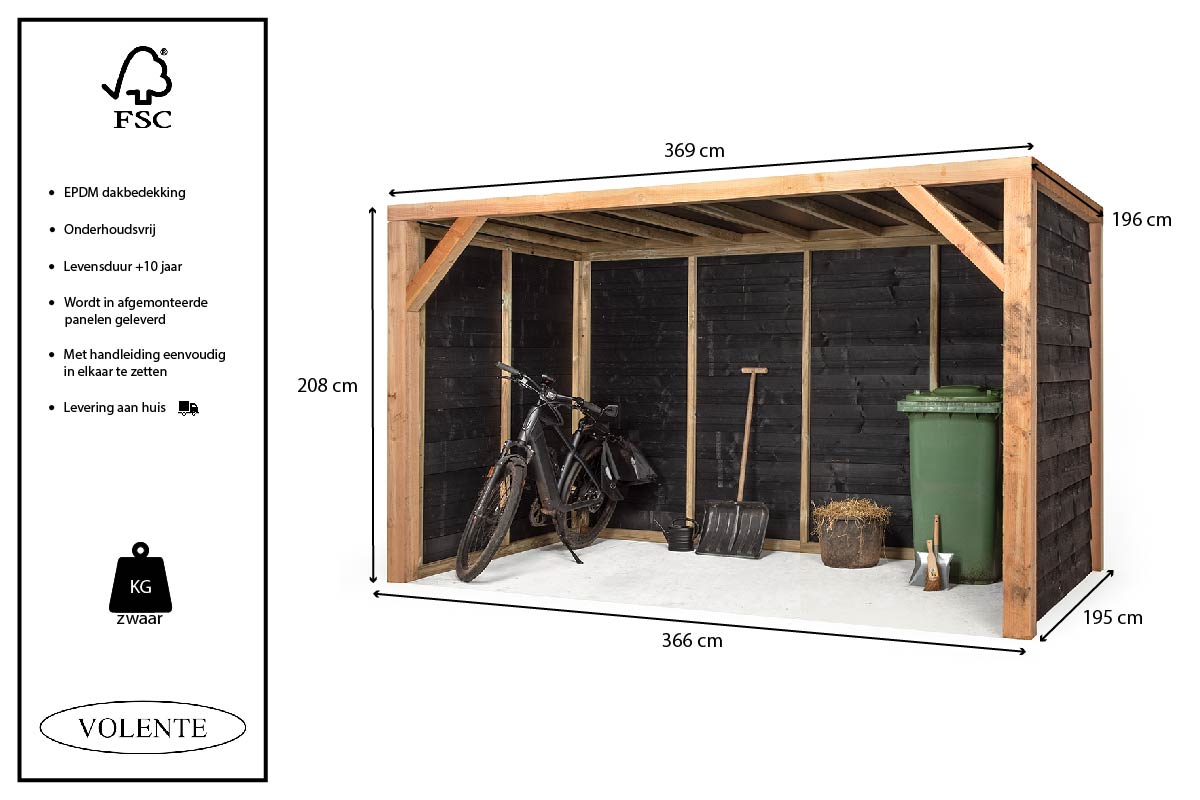 Dimensions spacieuses : avec des dimensions (extérieures) de 369 cm de largeur x 196 cm de profondeur x 208 cm de hauteur, le Levi offre suffisamment d'espace pour ranger plusieurs vélos en toute sécurité et au sec.