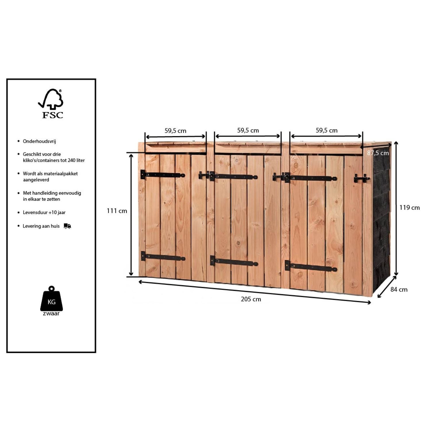 L'abri pour poubelles est fabriqué en bois Douglas durable, connu pour sa robustesse et son aspect naturel. Ce bois est naturellement résistant aux intempéries et ne nécessite pratiquement aucun entretien. Grâce à sa finition de haute qualité et à l'utilisation de ferrures galvanisées, l'abri restera en parfait état pendant de nombreuses années. Vous n'avez donc pas à vous soucier de la rouille ou de la déformation, même en cas de conditions météorologiques changeantes.