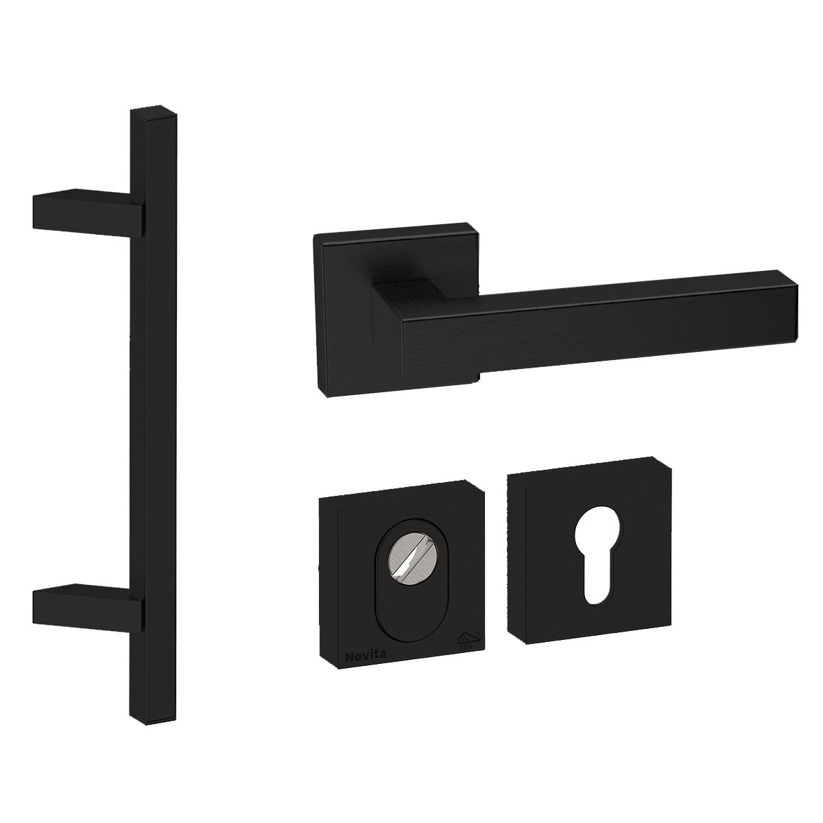 De voordeurset vierkant met Toronto schuin zwart biedt een stijlvolle en veilige afwerking voor uw voordeur. De set bestaat uit een blind te monteren handgreep, een SKG*** gekeurd veiligheidsrozet met kerntrekbeveiliging en een haakse deurkruk voor de binnenzijde. Dankzij het geïntegreerde veermechanisme is de deurkruk universeel toepasbaar voor zowel links- als rechtsdraaiende deuren.