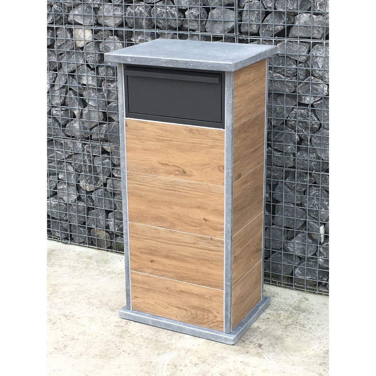Deze brievenbus is vervaardigd uit duurzame Belgische blauwe hardsteen en onderhoudsvriendelijke keramische tegels met houtlook. Deze materialen zijn volledig weerbestendig en behouden hun kwaliteit en uitstraling zonder veel onderhoud, waardoor jouw brievenbus er jarenlang als nieuw uitziet.