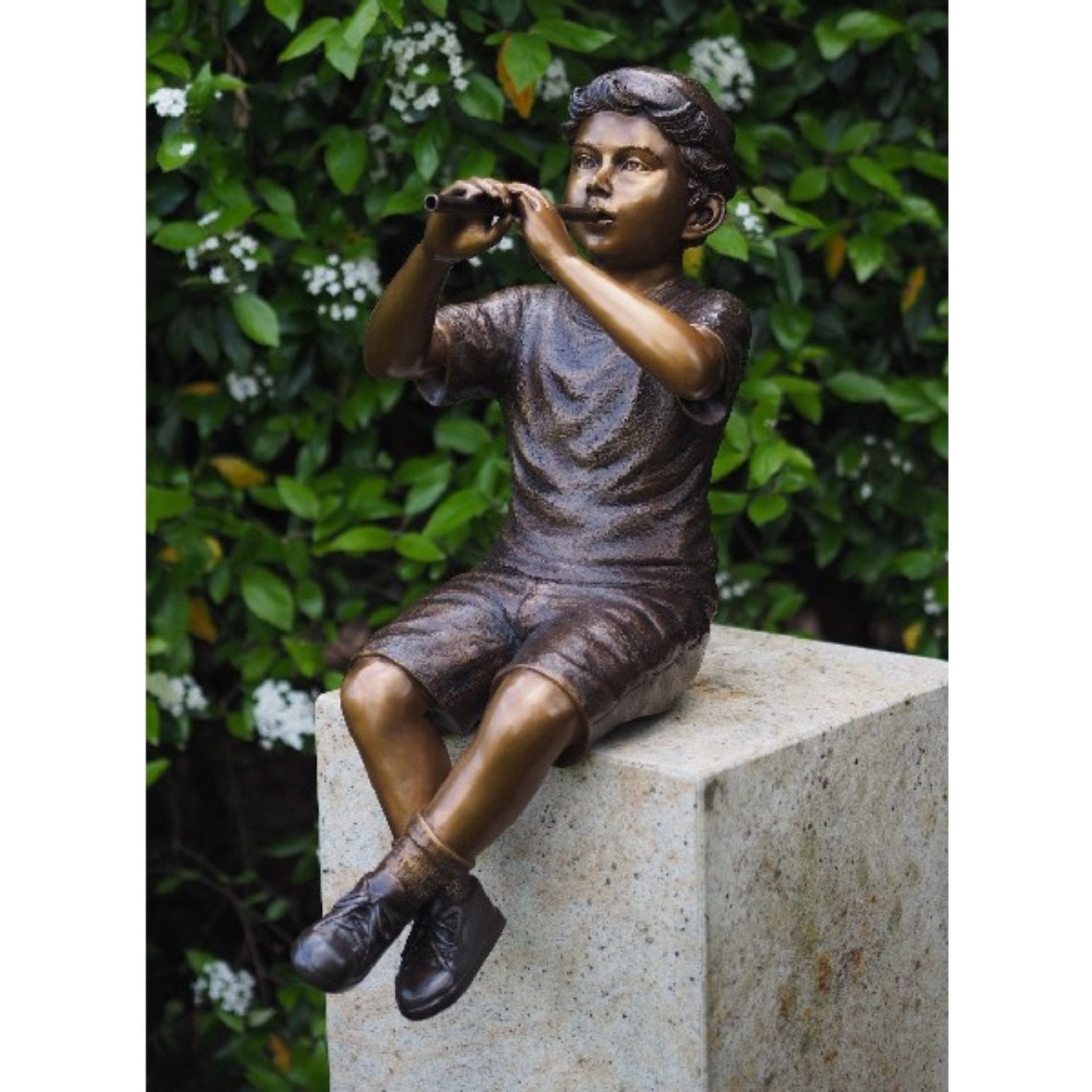 Flütlü Bronz Heykel Çocuk 75x39x32cm (YxGxU) heykeli, bronzun doğal sarı veya bakır rengini koyu kahverengi, yeşil veya siyah gibi zengin tonlara dönüştüren dikkatli bir kimyasal işlemle elde edilen canlı patinası ile öne çıkıyor. Bu, her görüntüye benzersiz bir görünüm kazandırarak her ortamda dikkat çekmesini sağlar. İster iç mekana ister dış mekana yerleştirilmiş olsun, çarpıcı bir sanat eseri olmaya devam ediyor.